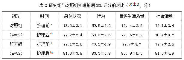专业医护人员对两组患者的QOL(生命质量)评分包括身体状况、行为、社会活动和自评生活质量,进行评分,满分100分,分数越高表示患者的QOL越高[3]。